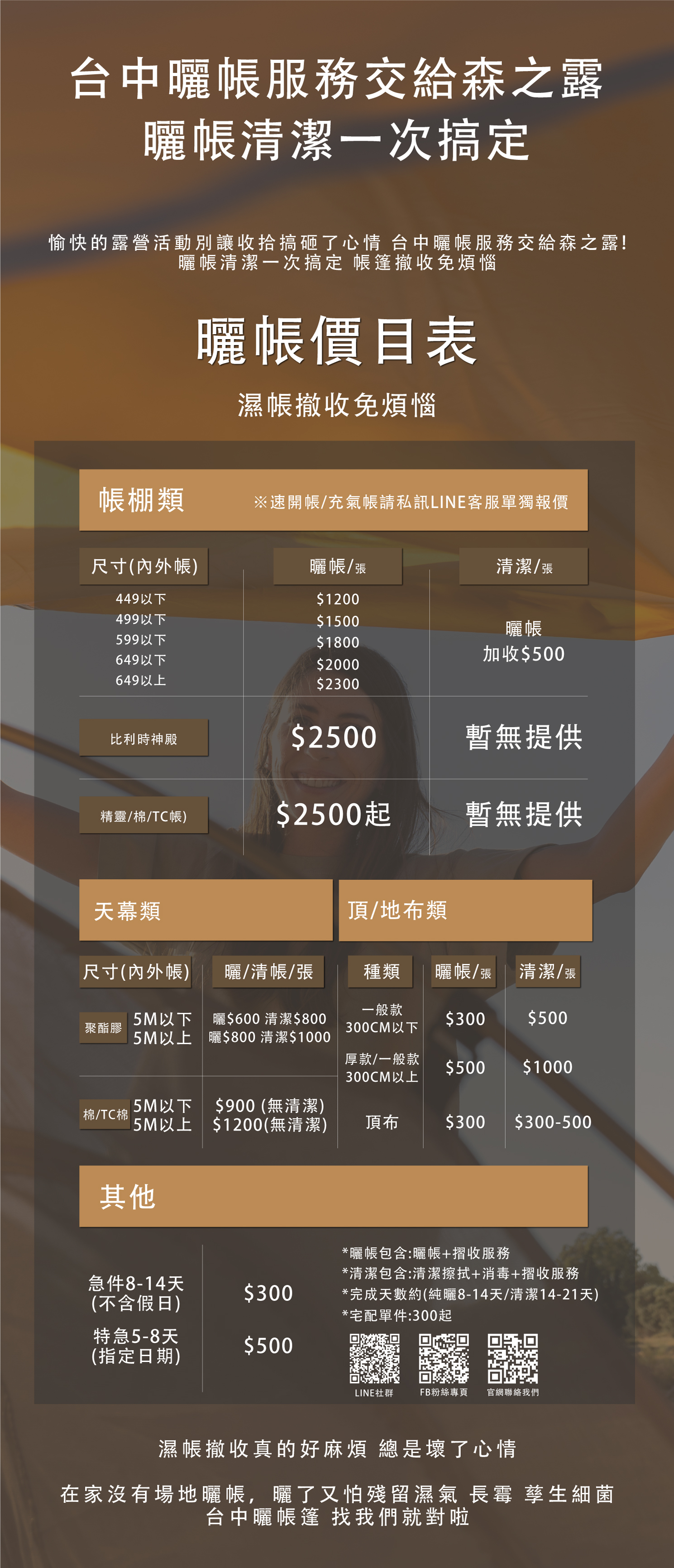 專業曬帳、清潔一站搞定,價格部分可參考圖表,需要此項服務請 「先行來電預約」或是 「LINE@官方」詢問空位唷!