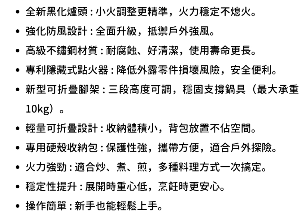 不鏽鋼材質黑化爐頭,可折疊不鏽鋼腳架,可調整高度。
