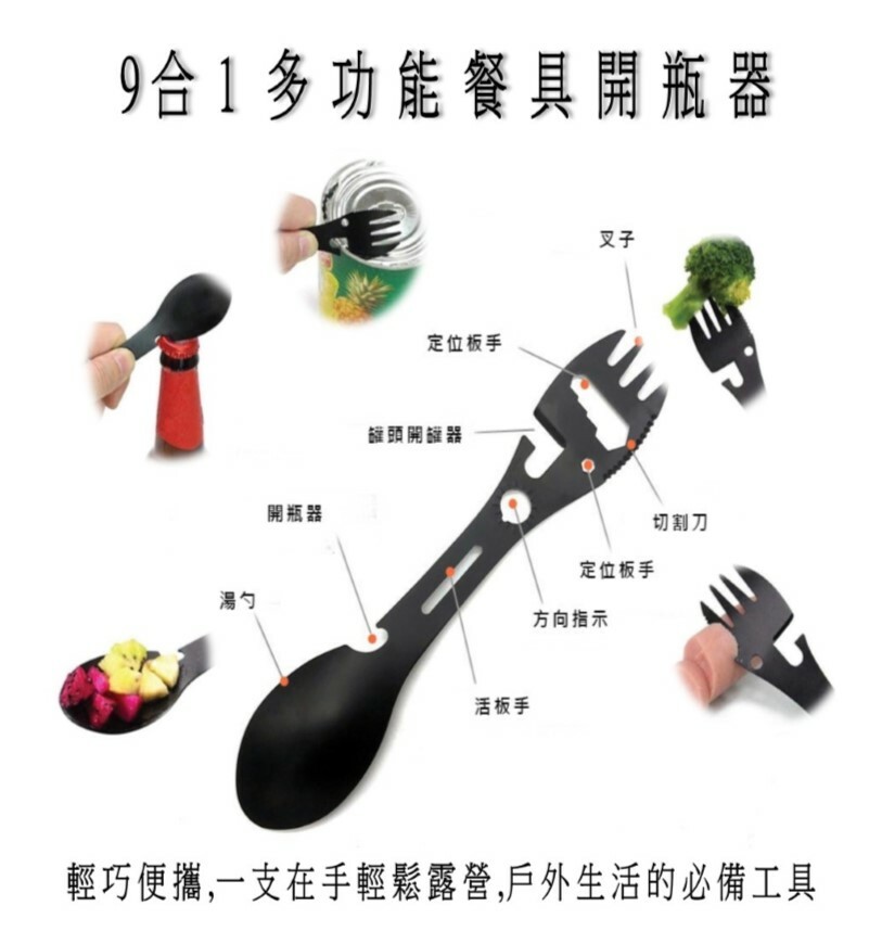多功能可以餐具(包含湯匙、叉子、刀子)、開瓶器、板手